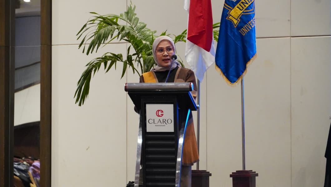 Dalam sambutannya, Ketua Badan Pembina Yayasan Universitas Fajar, Hj. Deniary Rachma Alwi, S.E., M.M., menyampaikan pesan inspiratif kepada para lulusan.