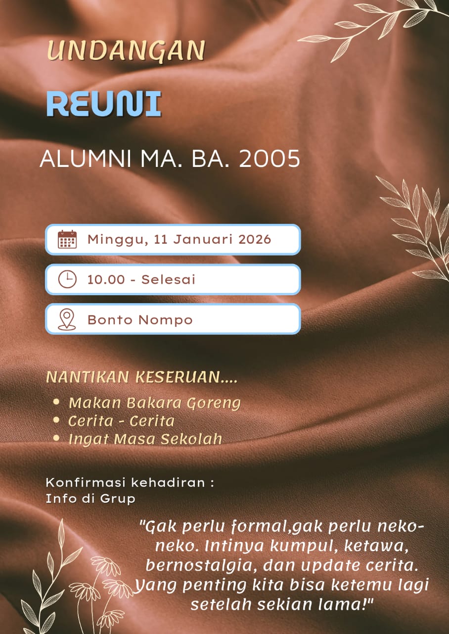 Angin itu akan menyambut mereka yang pernah berseragam putih - abu abu, duduk di bangku yang sama, dan berbagi mimpi di kelas yang sama. Mereka, generasi akhir 2005 Madrasah Aliyah Sombala Bella, akhirnya memutuskan untuk pulang. Pulang ke memori, pulang ke cerita, pulang ke satu nama : angkatan 2005.