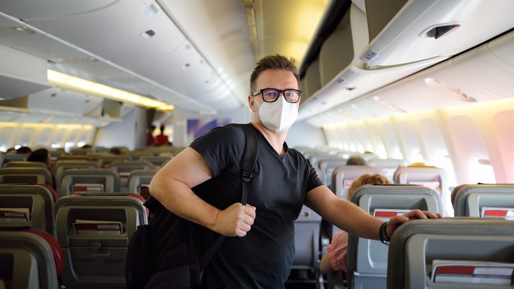 Foto Ilustrasi menggendong ransel di dalam pesawat.